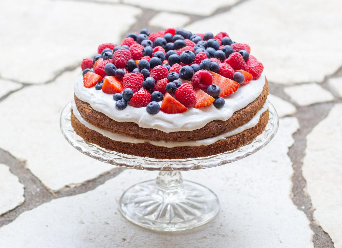 - Place the bottom on a cake platter and add half of the coconut cream on top. Make sure the cake has completely cooled off inside before you do this otherwise, the cream will melt. Distribute it evenly. Add about 1 cup of the berries on top. Cover with the top part of the cake and add the rest of the coconut cream on top. Cover with the rest of the berries. Use as many as you like and feel free to exchange the berries to your liking.