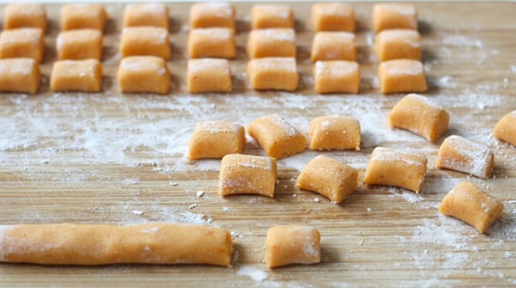 - Put a little bit of tapioca flour onto a large cutting board and distribute it evenly. Cut the dough into 4 parts. Roll each to make a thin rope. The thickness depends on how big you want your gnocchi to be. I recommend about half an inch. Now cut each rope into about 1-inch pieces. You can either freeze them now or cook them.