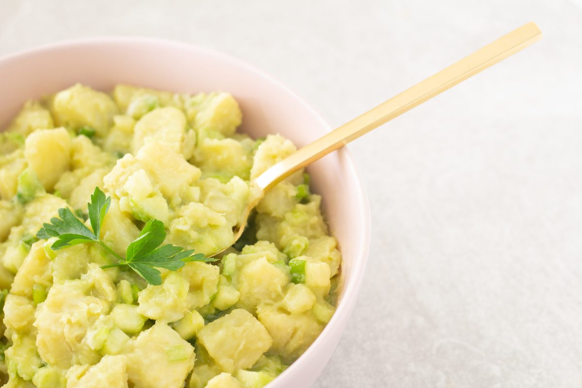 Once the potatoes are done let them cool off for a few minutes. Cut them into smaller pieces, add them to all the other veggies and add the dressing. Mix until all potatoes are coated. Taste and add more salt if needed. Serve immediately or store in the fridge for a couple of days.
