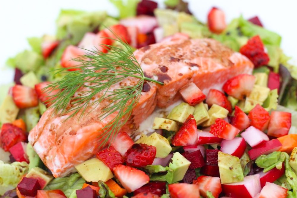 - In the meantime wash and chop the lettuce, radishes and strawberries. Peel and chop the carrots, beet and avocado. Serve the salad in two medium sized bowls or on plates. Add the dressing.