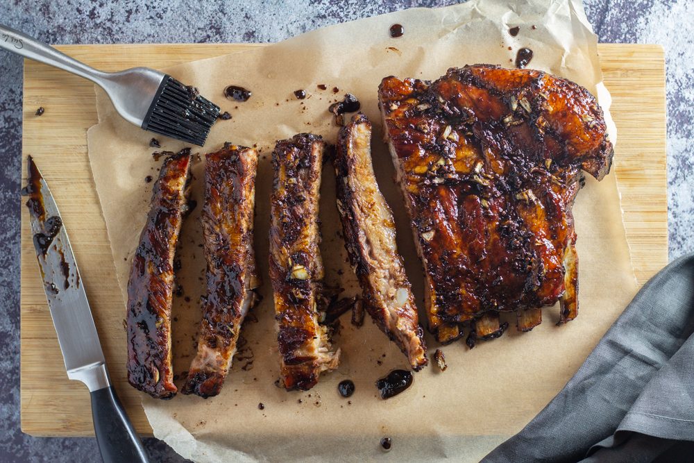 Line a large baking sheet with parchment paper. Place the ribs on the baking sheet and baste both sides of the ribs with about half of the glaze. Cover the baking sheet and the ribs using another baking sheet and roast for 1 hour in the middle of the oven.