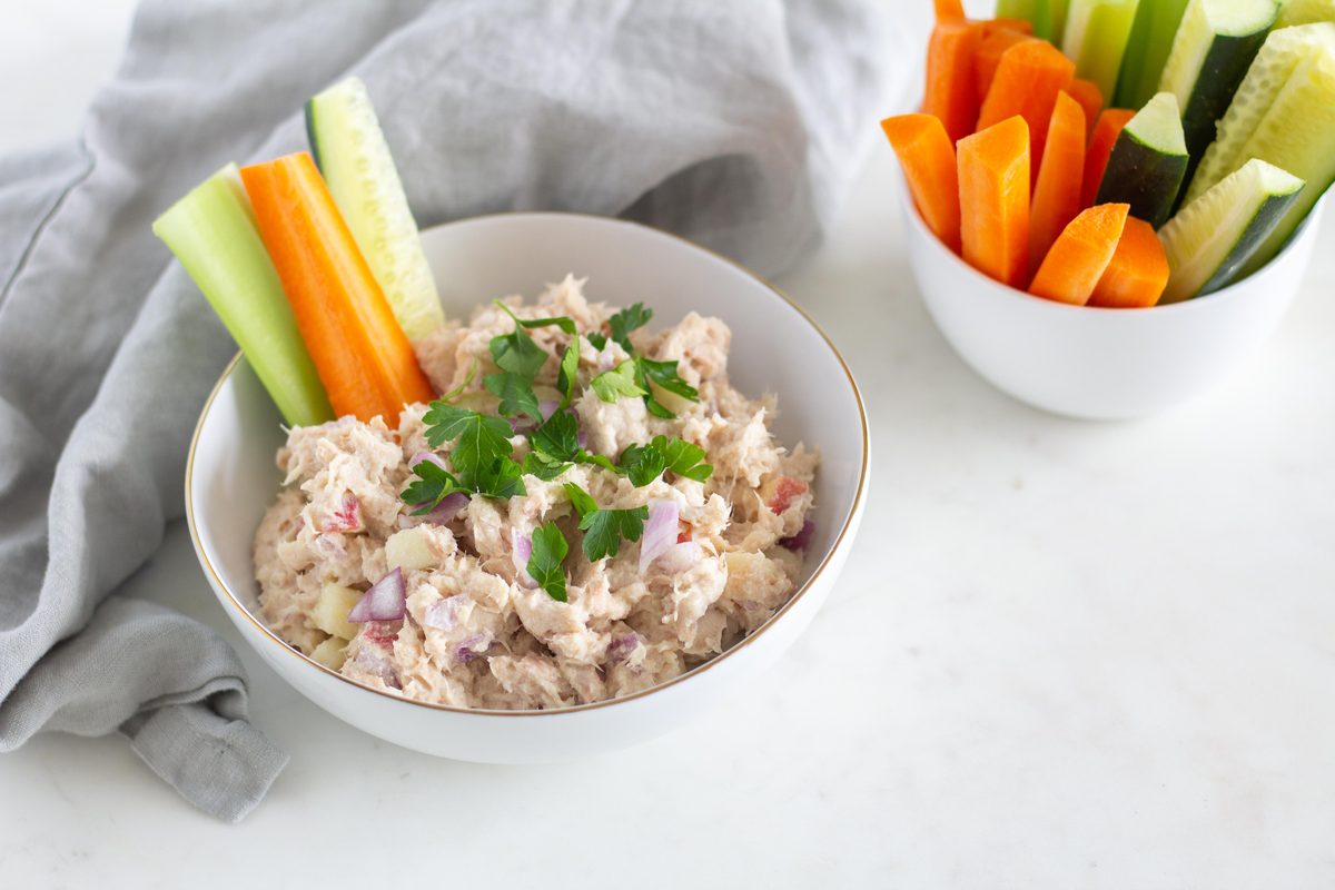Finely mince onion and chop apples into small pieces. Add them to the tuna mix and stir. Depending on how many apple pieces you would like in your dip, either add 1/4 or 1/2 an apple. Season with salt and pepper to your liking.